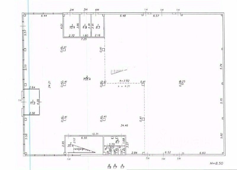 - Общая площадь 1 240 м2: первый этаж 755 м2, второй (антресоль) 388 м2.