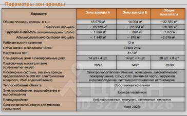 В зонах расположены стандартные доки, а также парковочные места для грузовых и легковых автомобилей, что обеспечивает удобство логистики и эксплуатации.