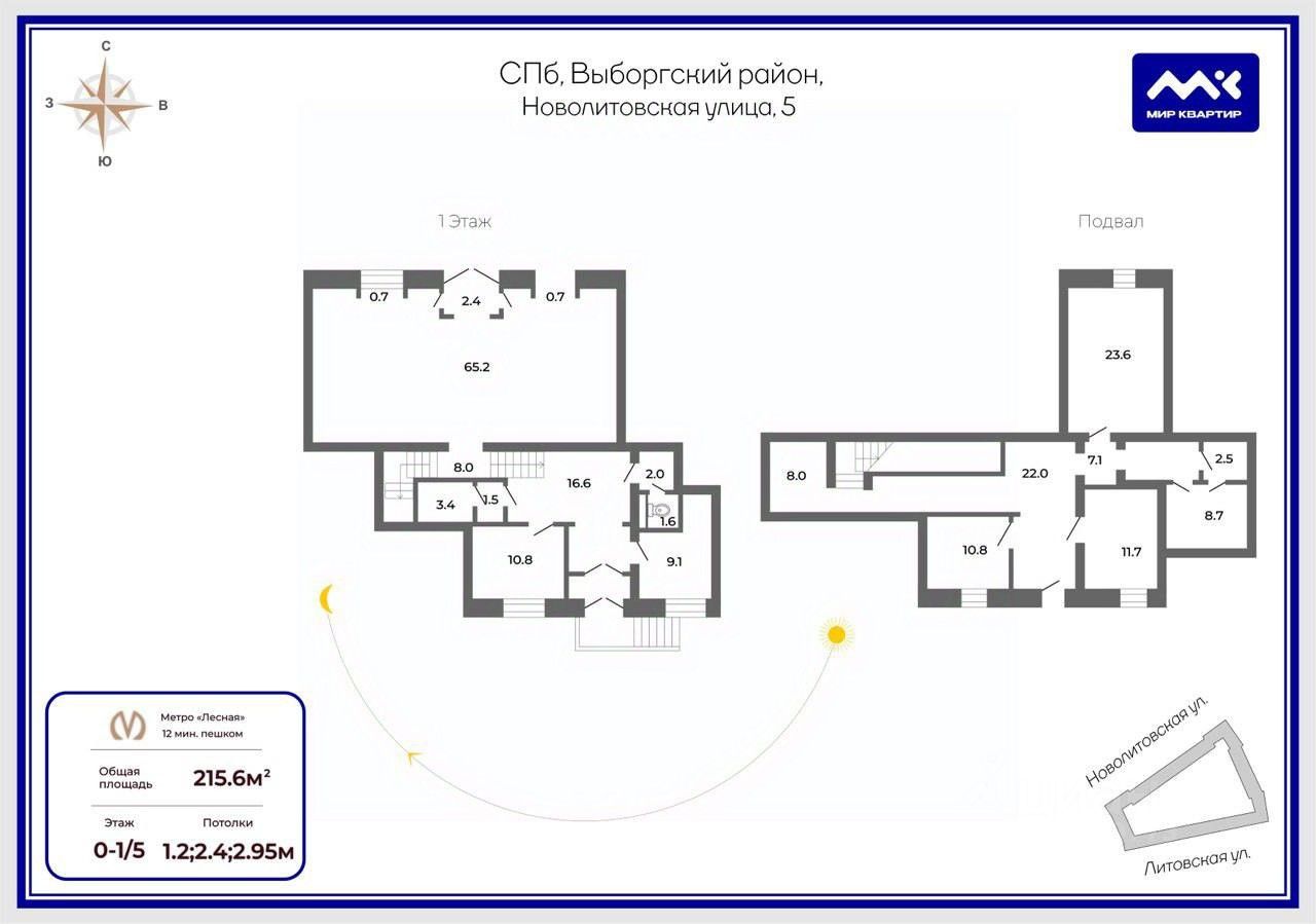Два уровня: первый этаж: 110 м.кв. торговый зал 65 м.кв. + хоз.площади, высота потолка 3.6 метра, два высоких арочных окна "в пол"; полуподвал, сухой и отапливаемый,105 м.кв., высота потолка 2.5 метра, идельно под склад.