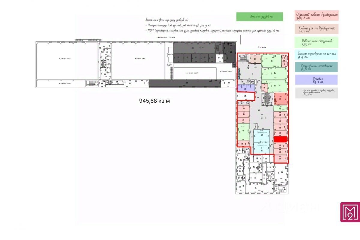 — Общая площадь: от 900 до 3000 кв.м (планировка смешанная, преимущественно кабинеты, частьформата open space)