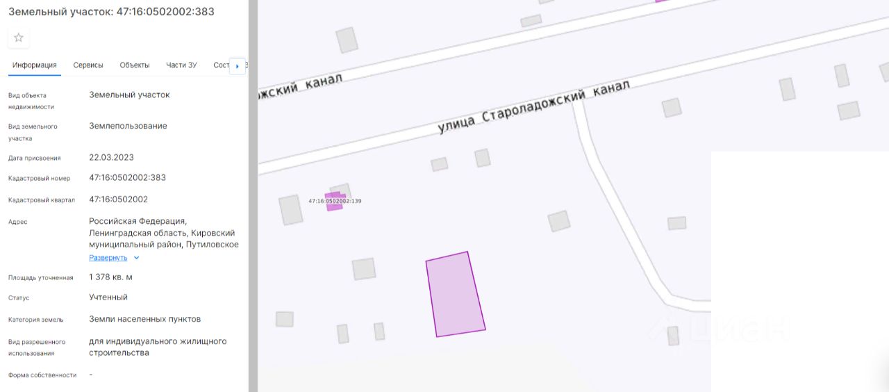 Площадь 1378 кв.м., кадастровый номер 47:16:0502002:383