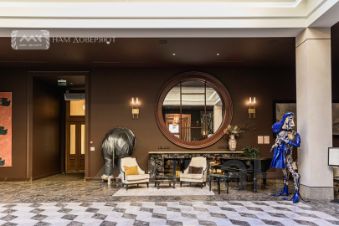 Атриум с роялем и арт-объектами и библиотекой с презентабельной зоной для переговоров;