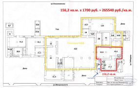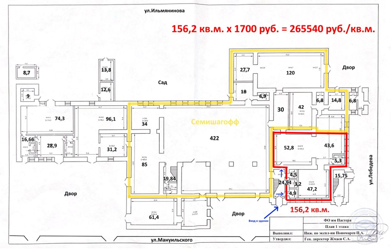 Предлагаю в аренду помещение 156,2 кв.м с двумя санузлами на первом этаже с отдельным входом, расположенным в метре от входа в большой продуктовый магазин Семишагофф (это наш якорный арендатор, проходимость 2500 человек в день), офис со свежим ремонтом, 1700 руб./кв.м. в месяц. + коммунальные платежи, пропорционально метражу и электричество по счётчику.