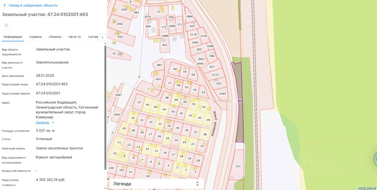 Земельный участок с кадастровым номером 47:24:0102001:463, площадью 3 007 (три тысячи семь) кв.м., расположенный по адресу: Российская Федерация, Ленинградская область, Гатчинский муниципальный округ, город Коммунар. Категория земель: земли населенных пунктов. Разрешенное использование: ремонт автомобилей. Граница земельного участка установлена в соответствии с требованиями земельного законодательства. Сведения об обременениях: - смотри градостроительный план, размещенный в разделе "Документы".
