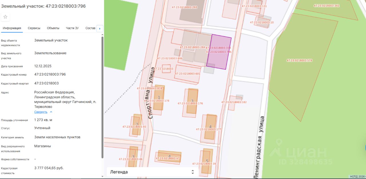 Земельный участок с кадастровым номером 47:23:0218003:796, площадью 1 273 (одна тысяча двести семьдесят три) кв.м., расположенный по адресу: Российская Федерация, Ленинградская область, муниципальный округ Гатчинский, п. Терволово. Категория земель: земли населенных пунктов. Разрешенное использование: магазины. Граница земельного участка установлена в соответствии с требованиями земельного законодательства. Сведения об обременениях: - смотри градостроительный план, размещенный в разделе "Документы".