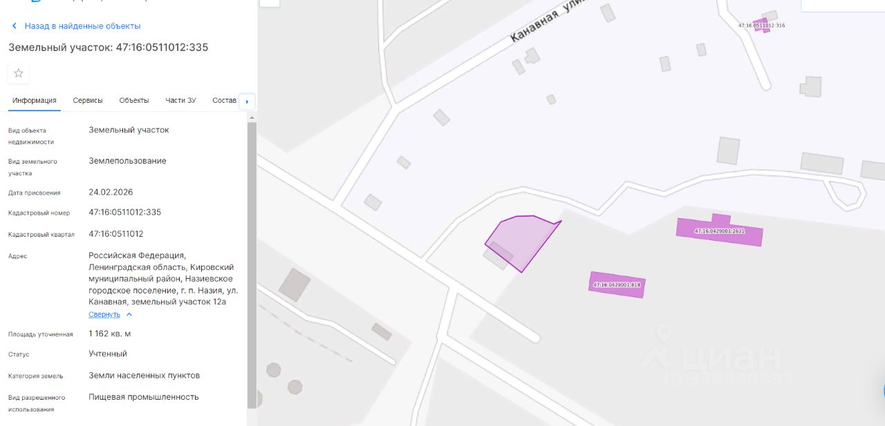 Площадь 1162 кв.м., кадастровый номер 47:16:0511012:335, категория земель: земли населенных пунктов, виды разрешенного использования: пищевая промышленность.