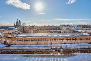 Вход с набережной. Охрана, ресепшен, пропускной режим.