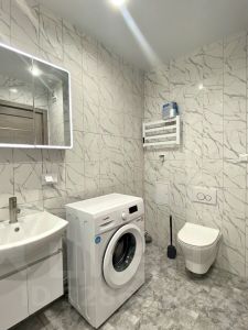 После ремонта помещение еще не использовалось. Пол в помещении -ламинат, в санузле - керамогранит, стены окрашены "под штукатурку" в нейтральных оттенках. Санузел оборудован всей необходимой новой сантехникой и стиральной машиной.