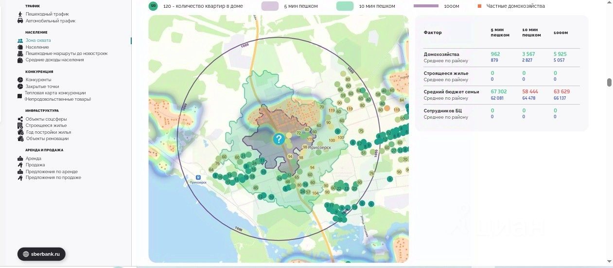 - 2 948 жителей и 2 289 домохозяйств в радиусе 500 м — высокая плотность