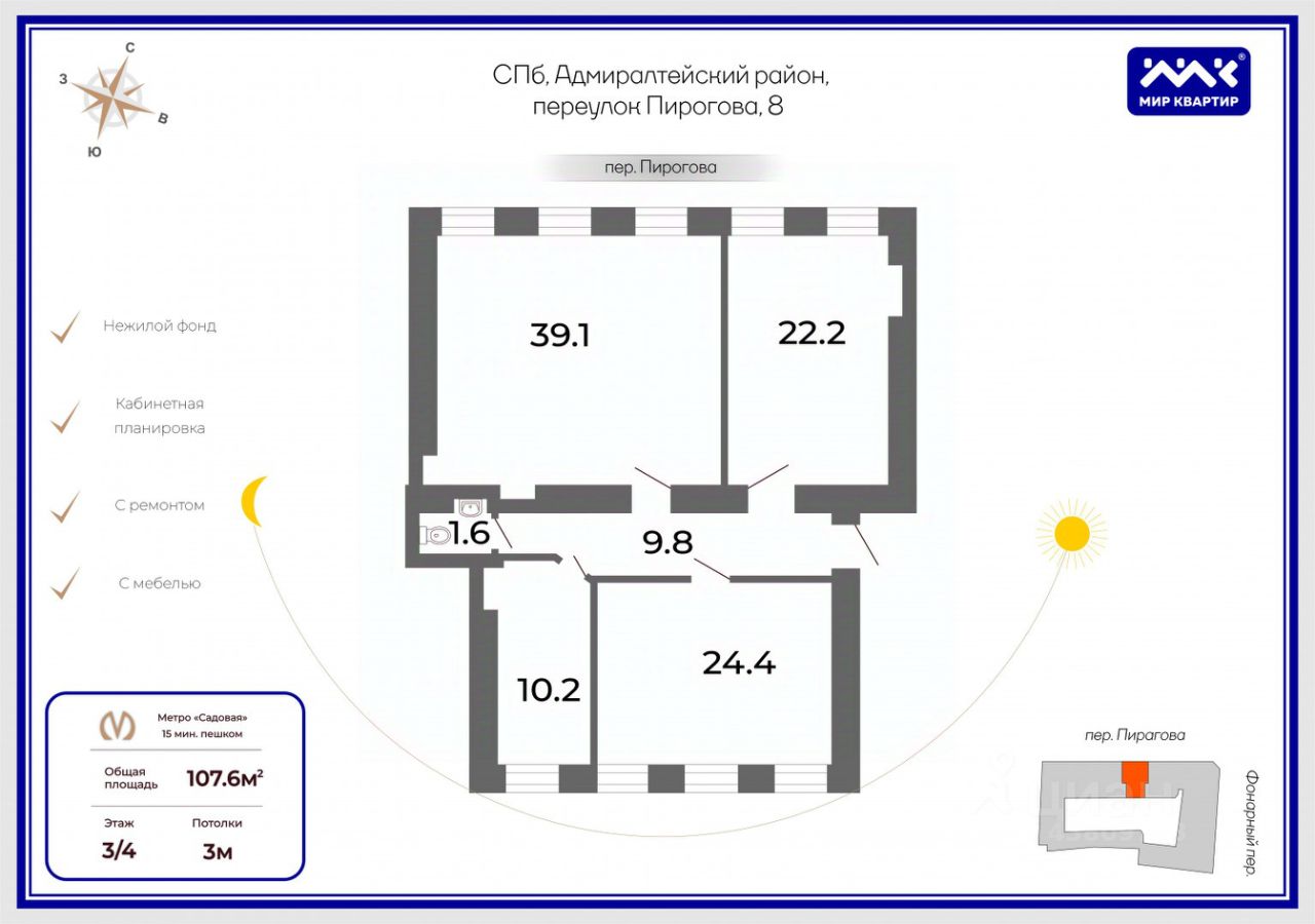 Пешая доступность до метро Сенная, Садовая.