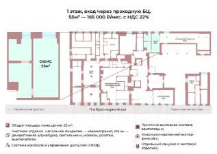 Сдается светлое помещение общей площадью 55 м² на 1м этаже бизнесцентра. Отличный вариант для небольшого офиса, консультационного центра, кабинета специалистов или представительства компании.