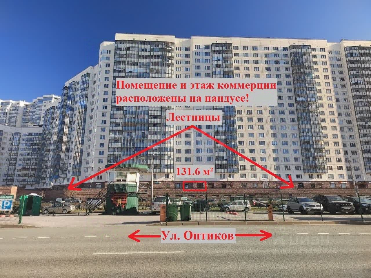 Предлагаем в аренду коммерческое помещение свободного назначения общей площадью 131.6 кв.м на первом этаже, который расположен на пандусе. Расположено по адресу: ул. Оптиков, 45к1, в современном жилом доме 2014 года постройки. Отдельный вход со двора, высота потолков 4 м, чистовая отделка с выполненным ремонтом, мощность 35 кВт. В шаговой доступности проживает более 20 000 потенциальных клиентов. Прямая аренда от собственника с возможностью арендных каникул. Звоните, все расскажем и покажем!