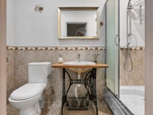 Квартира состоит из кухни- столовой -зала , трех отдельных спален и двух санузлов : один с большой ванной, другой с душевой кабиной.