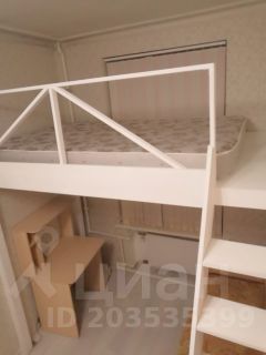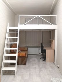 В комнате имеется: выделенное спальное место с матрасом на верхнем уровне, диван, компьютерный стол, стул, обувница, вешалка для верхней одежды, вместительный шкаф для одежды, комод, холодильник и тумба для кухонных принадлежностей. Стиральная машинка стоит в коридоре.