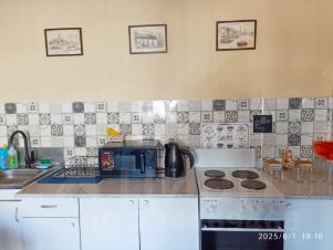 Стир.машинка, полотенца,мыло. Микроволновая плита, электроплита, электрический чайник, посуда, столовые приборы. Всегда: чай, сахар, конфетки. Телевизор,WI-fi.