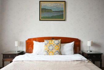 - Удобная двуспальная кровать шириной 160 см и кушетка в спальне, двуспальный диван на кухне