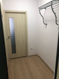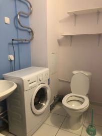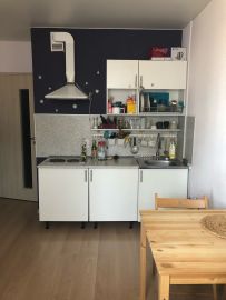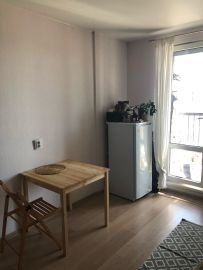Квартира на 12 этаже 14-этажной секции. Окна во двор (нет шума от дорог). Два лифта: грузовой и пассажирский, домофон. В комплексе можно снять в аренду парковочное место, так же есть места для бесплатной парковки. Квартира 23 метра: комната 14,5 кв.м., прихожая 2,80 кв.м., совмещенный с/у с( ванная, а не душевая кабина) 3,90 кв.м, большая остекленная лоджия (напольное покрытие в лоджии: акация, Икея), Квартира с чистовой отделкой: стеклопакеты, на полу ламинат (в комнате и коридоре), плитка в с/у, светлые обои. ТВ и интернет подключаются при желании. Свет, вода, тепло счетчики. Установлена кухня с плиткой для готовки, хорошая нешумная вытяжка, холодильник; есть удобный Диван-кровать Икея (раскладывается в двуспальную кровать), стол, стулья, стеллаж-шкаф Икея для одежды и обуви.