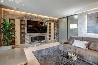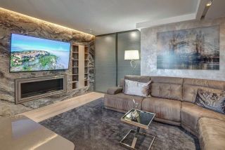 Центральное место в гостиной занимает большая стена из натурального гранита. В неё элегантно вписаны итальянские книжные шкафы, большой ТВ-и настоящий биокамин на живом огне . Напротив расположен просторный итальянский диван с двумя независимыми зонами релакс.