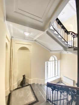 Одна из лучших Парадных лестниц Санкт-Петербурга с мраморными ступеньками украшена скульптурами, входная группа с ковровым покрытием, скамьями с лепниной, антуражной люстрой.