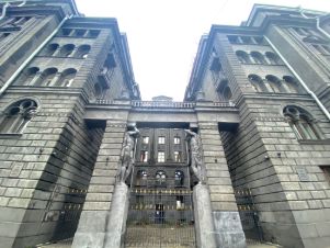 Безопасный вход в закрытый двор с набережной Крюкова канала осуществляется через величественные ворота высотой в два этажа, украшенные фигурами Атлантов.