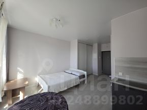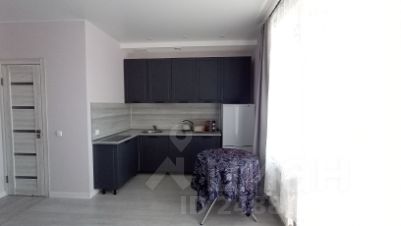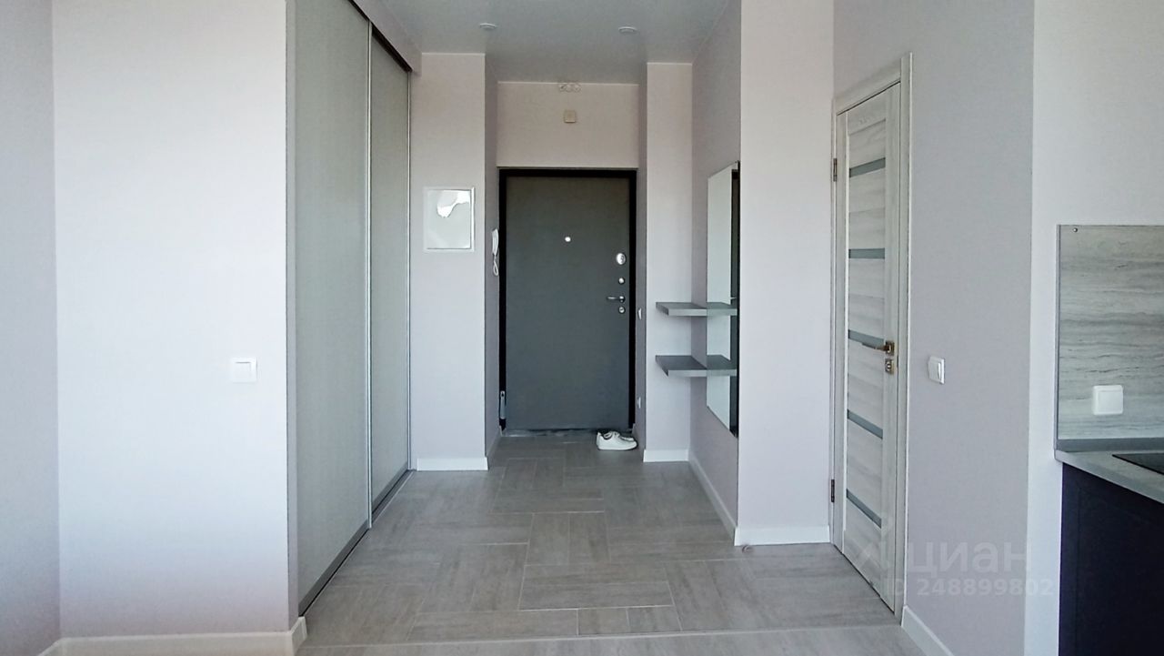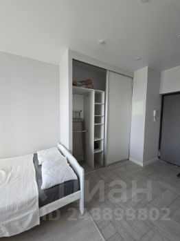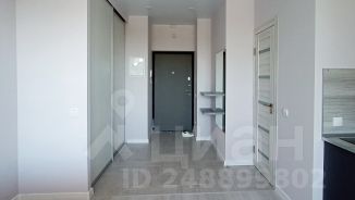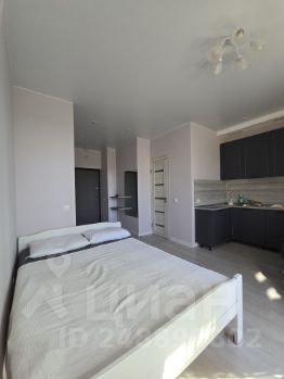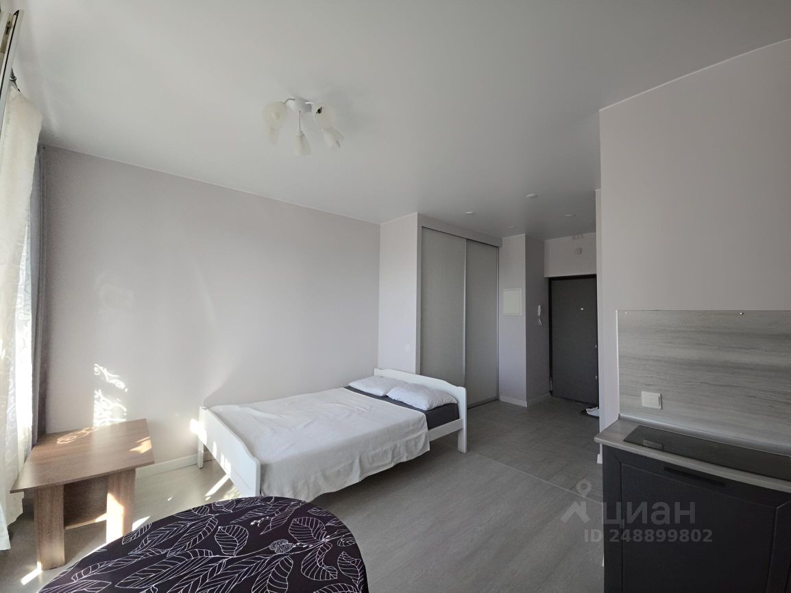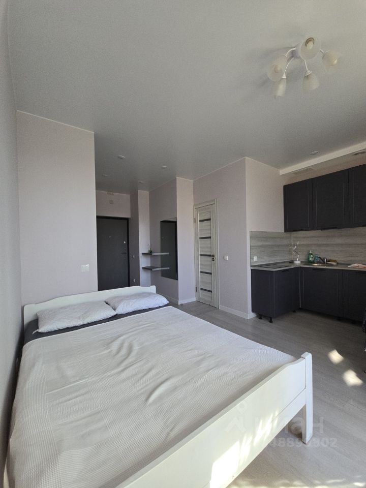 Солнечная студия в серых тонах, с большими окнами. Удобная планировка: просторная входная зона, встроеннный гардеробный шкаф, кухонный гарнитур, двуспальная кровать, стол, ванная комната с душем.