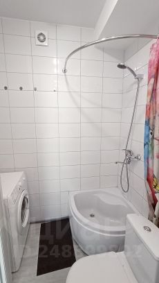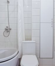 С/у совмещённый: высокий душевой поддон со шторкой, унитаз, раковина, встроенный хозяйственный шкаф, стиральная машина.
