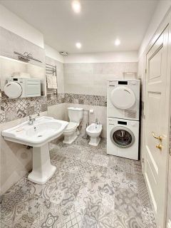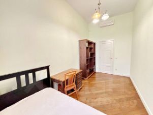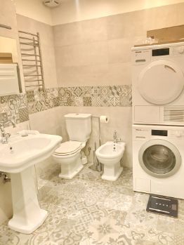 Уютная классическая спальня, с прикроватными тумбами и с гардеробной комнатой. Вторая комната имеет кровать, рабочий стол и шкафчик с полками. Есть вся бытовая техника, включая кондиционеры в каждой комнате, посудомоечную машину. Два сан/узла. Ванна. Биде. Пол натуральное дерево, кафель -пол подогрев.