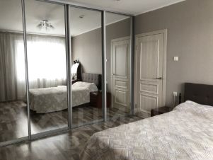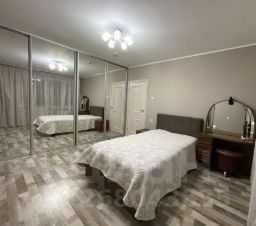 Комната: кровать, вместительный зеркальный шкаф-купе, тумба, трюмо с пуфиком.