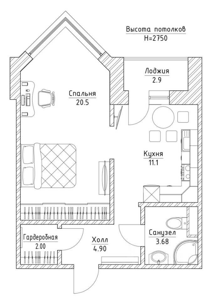 Кухня 11 кв. м. Высота потолков 2,75 мера.