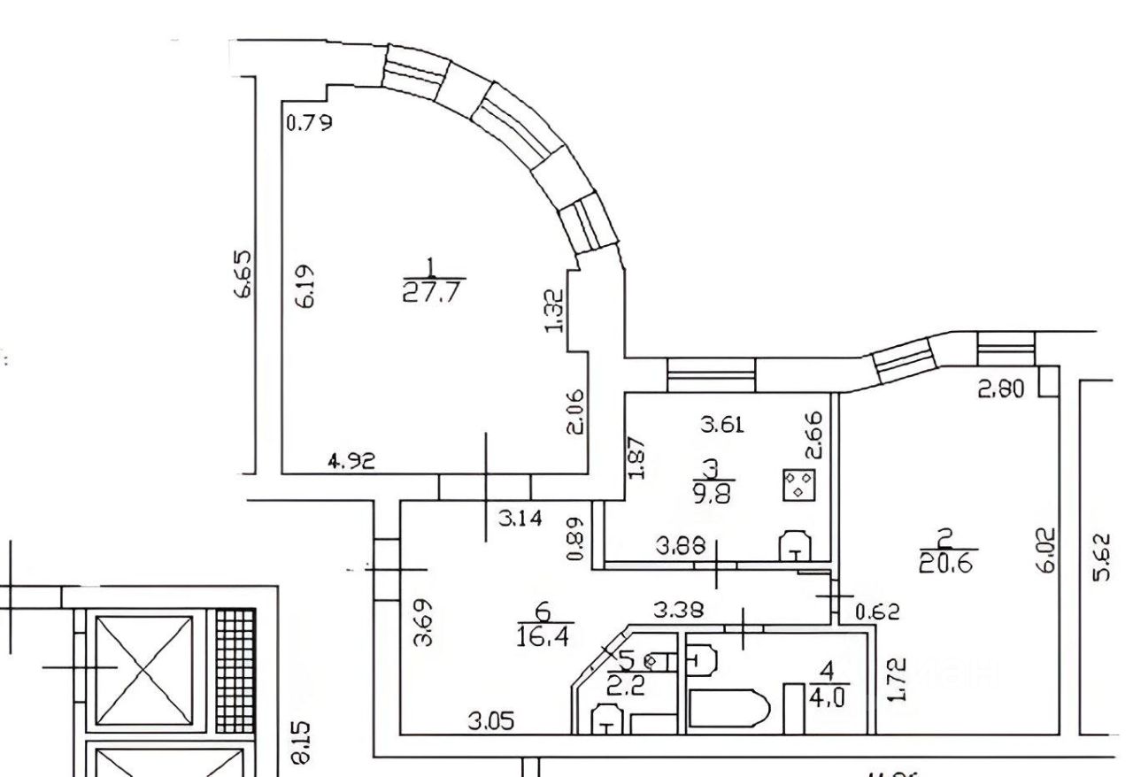 Квартира светлая и тёплая: окна выходят на Юго-Запад. Комфортная для проживания планировка: две изолированные комнаты 27,7+20,6 кв.м., между ними расположена кухня 9,8 кв.м квадратной формы со встроенной кухонной мебелью и техникой (варочная панель, духовой шкаф, посудомоечная машина, микроволновая печь, холодильник), санузел раздельный 4,0+2,2 кв.м. (ванная, два унитаза с раковинами, стиральная машина), просторный холл 16,4 кв.м. с местом для хранения вещей. Без балкона/лоджии. В квартире курить запрещено!