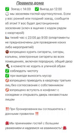 мы заселяем гостей круглосуточно. Если у вас ранний или поздний заезд, сообщите об этом! У вас будет дистанционное заселение (ключ в ящичке с кодом рядом с квартирой)