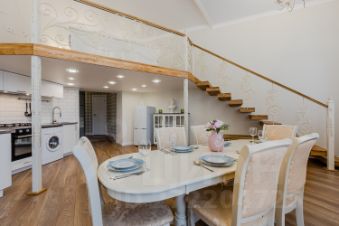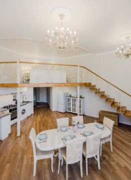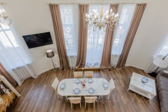 Двухуровневая квартира состоит из спальной зоны на втором этаже с двуспальной кроватью, просторной гостиной зоны (2 дивана-кровати), совмещенной с кухней и санузла с ванной. Располагается на 3-м этаже 4-этажного дома (без лифта). Окна и балкон выходят на Владимирский проспект, Графский переулок и театр Ленсовета. Подходит для размещения семьи или компании до 6 человек.