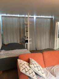 Есть кровать, диван (не раскладывается), пианино, система хранения Икеа, утюг, чайник, вся необходимая посуда. Возможен телевизор, по желанию. Кухонный гарнитур со встроенной бытовой техникой: вместительный холодильник, духовой шкаф, встроенная СВЧ-печь.