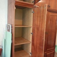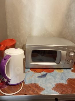 Двуспальный диван. Микроволновка, холодильник, электрический чайник, посуда, зеркало на колесиках, шкафы,стол.