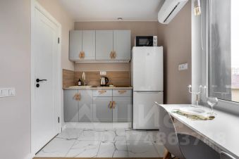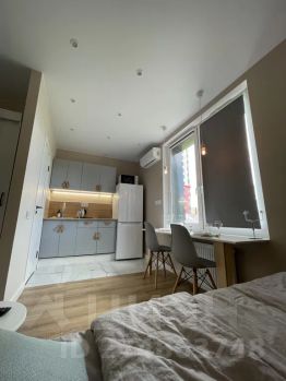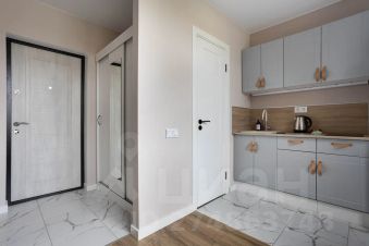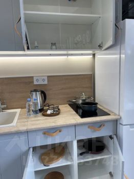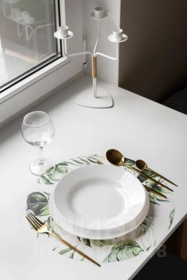 В зоне кухни удобный кухонный гарнитур со всем необходимым для приготовления вкусной пищи (кухонная раковина, варочная панель, СВЧ, полноразмерный холодильник с морозильной камерой, электрочайник, также есть сковорода, сотейник, кастрюля с крышкой, разделочная доска, ножи, тёрка, штопор), большой удобный обеденный стол с хорошим видом на город и комфортные эргономичные стулья.