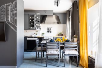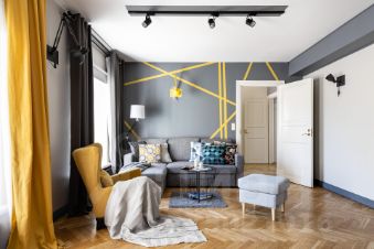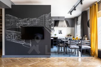 ДИЗАЙН. Апартаменты Little Italy выполнены в современном стиле. Цветовая гамма интерьера — благородные оттенки графита в сочетании с белыми и жёлтыми акцентами. Ощущение динамики создают графические элементы — геометричные линии на стенах и интерьерные граффити в гостиной