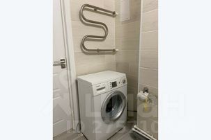 Стильная современная душевая в санузле, стиральная машина, фен, утюг, гладильная доска, сушилка, средства для принятия душа и стирки.