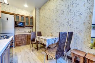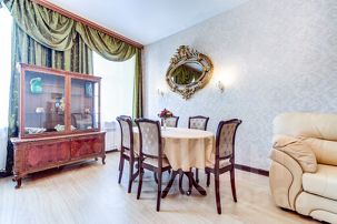 Эта современная, светлая и элегантно обустроенная трехкомнатная квартира находится на 3 этаже 3-этажного здания, откуда открывается замечательный вид на канал Грибоедова. Общая площадь квартиры составляет 87,4 кв. м. Квартира состоит из 3 изолированных комнат: 2 спален и 1 гостиной, раздельного сан. узла, полностью укомплектованной кухни. В 1-ой спальне расположены декоративный камин, панно в восточном стиле, двуспальный раскладывающийся диван, телевизор со столиком, зеркальный шкаф и 2 стула. 2-ая спальня оборудована двуспальной кроватью, 2-мя прикроватными тумбочками, шкафом, большим плазменным телевизором. Гостиная снабжена обеденным столом со стульями, 2 декоративными секретерами, двуспальным раскладывающимся диваном, большим плазменным телевизором. Кухня полностью укомплектована самой современной техникой: сенсорным холодильником, СВЧ с функцией SMART INVENTER, газовой варочной панелью, встроенным духовым шкафом, посудомоечной машиной, кухонной вытяжкой, и также обеденным столом со стульями. В квартире имеется стиральная машина. Интерьер квартиры выполнен в светлых тонах, вид спальни и гостиной выходит на набережную. Данная квартира идеально подойдет для размещения 6 даже самых притязательных гостей и очарует своим уникальным интерьером. Вход в квартиру с набережной канала Грибоедова. В 2 минутах ходьбы находится Казанский собор и центральная магистраль города Невский проспект.