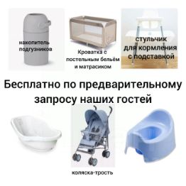 * всё для проживания с детьми по предварительному запросу предоставим бесплатно: кроватка, стульчик для кормления, горшок, заглушки для розеток, детская посуда, накопитель подгузников