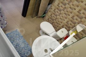 Санузел: совмещенный, полностью в кафеле, полноценная ванна, шкафчик, раковина, унитаз, ниша для мелочи.