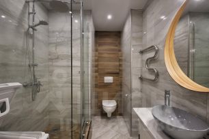 2) Совмещенный санузел с душевой кабиной, красивой зоной для умывания, стиральной машиной.