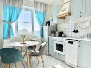Полноценная кухня с плитой, холодильником, СВЧ печью, электрочайником и всей необходимой посудой