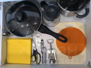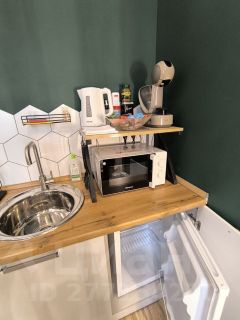 - мини-кухня с индукционной плитой и набором необходимой посуды, а также чайник, микроволновка, капсульная кофемашина (чашка вкусного кофе утром вам гарантирована), мини-холодильник,