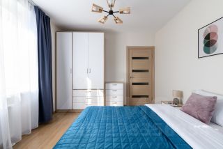 двуспальная кровать в спальне и диван-кровать в кухне-гостиной