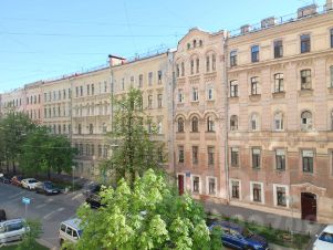 ВИД из высокого окна с широким деревянным подоконником на тихую 11 линию и доходные дома начала 20 века.