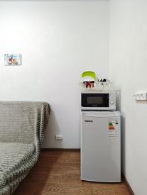Есть все необходимое: Диван-кровать Икея Бединге, стол, шкаф, холодильник, СВЧ, индукционная плитка, чайник, посуда, стиральная машинка, утюг.