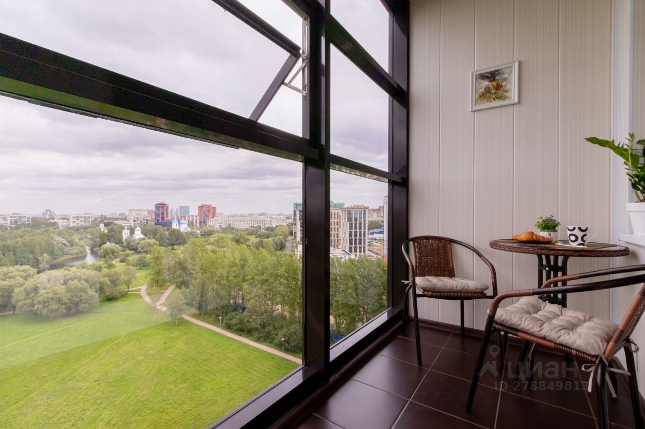 С большого балкона с панорамным остеклением видно Лахта - центр, парк, миллионы огней большого города.