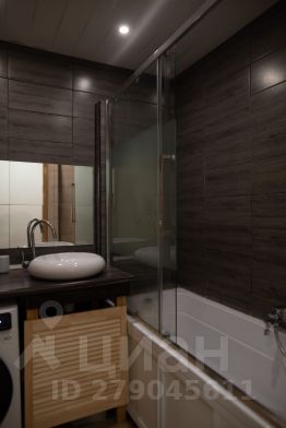 В ванной комнате установлена новая стиральная машина, большое зеркало и сама ванная.