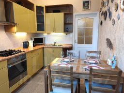В квартире могут разместиться 5 человек. В гостиной 2 спальных места на раскладном диване, в спальне двуспальная кровать. Также предоставляется раскладная кровать, которую можно установить как в спальне, так и в гостиной. В распоряжении гостей: газовая плита с духовым шкафом, холодильник, микроволновая печь, чайник, стиральная машина, капсульная кофеварка, утюг и гладильная доска, фен, бойлер, бесплатный высокоскоростной Wi-Fi, кабельное TV.