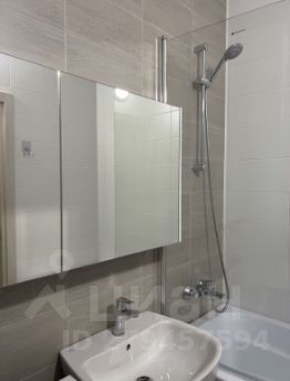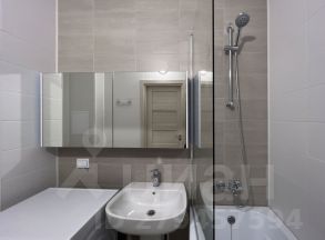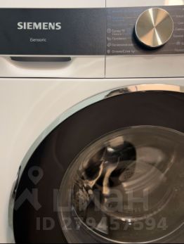 4. Совмещенный санузел с ванной, никаких шторок, стеклянная перегородка, раковина и вместительный зеркальный шкафчик для хранения. Снизу расположена стиральная машина с функцией сушки Siemens.